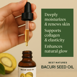 SKATINA NATŪRALŲ ODOS ATSINAUJINIMĄ. Bacuri aliejus pasižymi puikiomis regeneracinėmis savybėmis, padedančiomis atkurti pažeistą ar sausą odą. Jis gali pagerinti odos tekstūrą ir tonusą, todėl idealiai tinka šiurkščiai ir nelygiai odai.