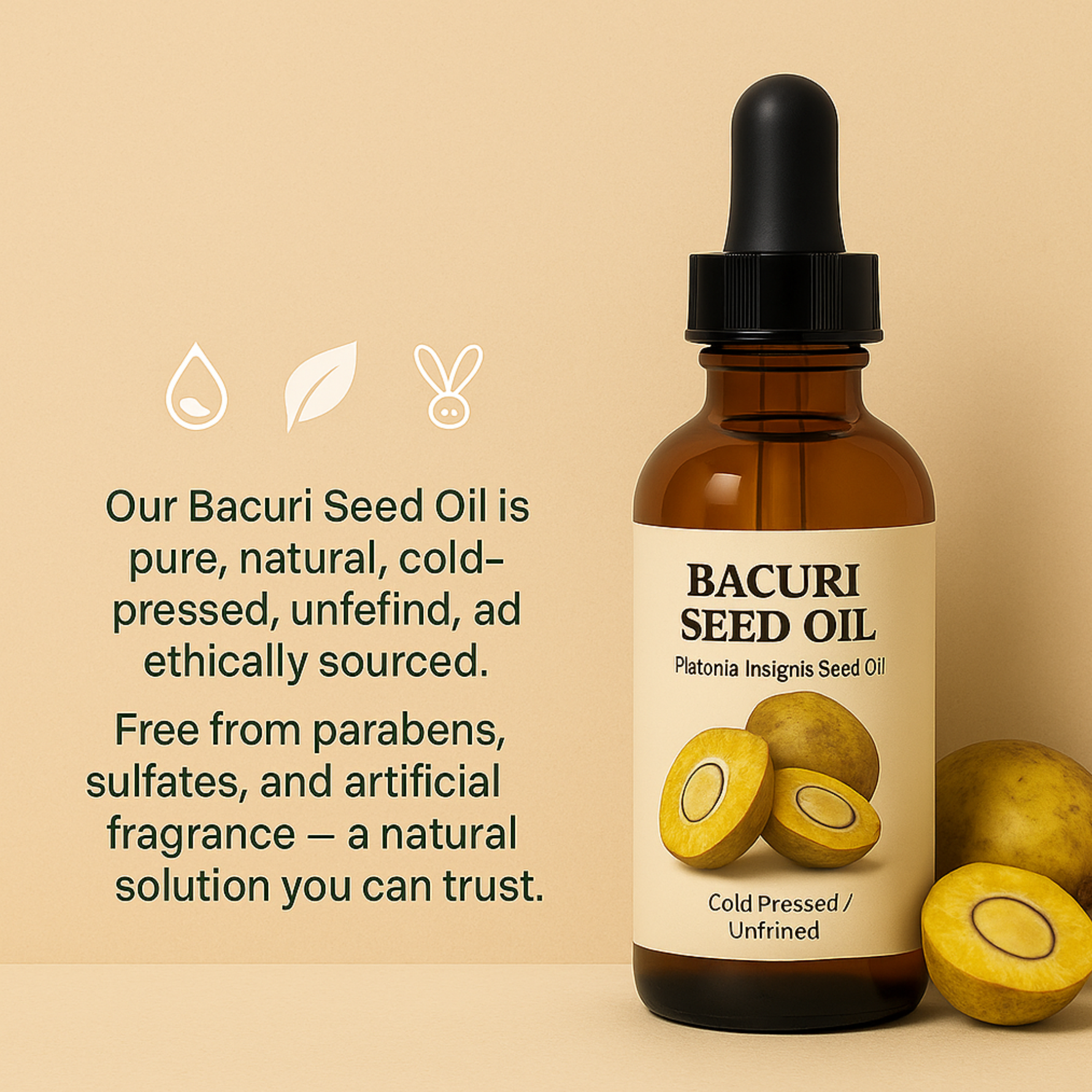 Ekologiškai pagamintas Bacurí aliejus yra išgaunamas iš „Platonia Insignis“ vaisių sėklų, kilusių iš drėgnų Amazonės atogrąžų miškų. Aliejus žinomas dėl savo turtingos sudėties bei naudingų savybių. Bacuri aliejus aliejus pasižymi unikalia riebalų rūgščių ir antioksidantų sudėtimi. Natūralios Bacuri aliejaus stangrumo, drėkinamosios, sutraukiančios ir ląstelių atnaujinimo savybės padeda giliai hidratuoti odą ir pašalinti negyvas ląsteles, kad atskleistų tvirtesnę ir sveikesnę odą.
