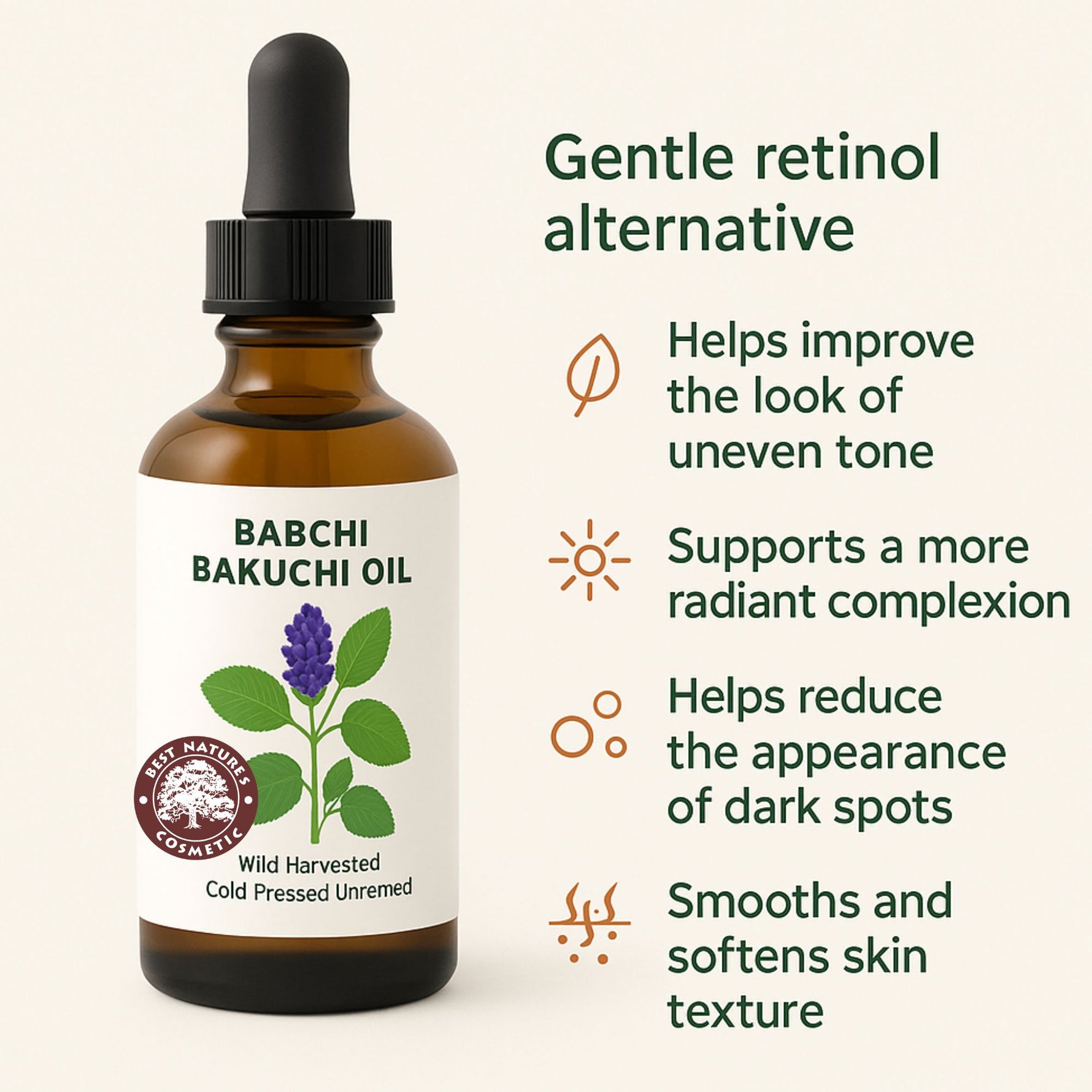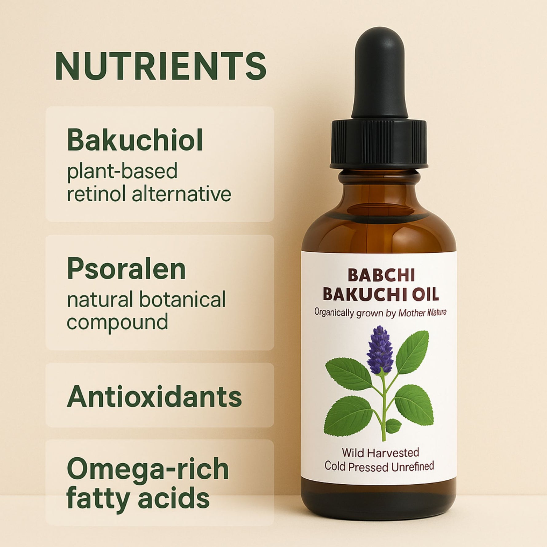 Psoralea corylifolia augalas yra nepaprastai biologiškai svarbus, natūraliai gausus antioksidanto bakuchiolio. Bakuchiolis laikomas kita alternatyva sintetiniam retinoliui (vitamino A) – ingredientui, kuris tradiciškai naudojamas odos senėjimą stabdančiose priemonėse. Skirtingai nuo sintetinio retinolio, Bakuchi (Babchi) aliejus yra švelnus jautriai odai ir tinka kasdieniam naudojimui. 100 % grynas Bakuchi (Babchi) aliejus – šalto spaudimo, natūralus, nerafinuotas, be kvapiųjų medžiagų, priedų ar konservantų.